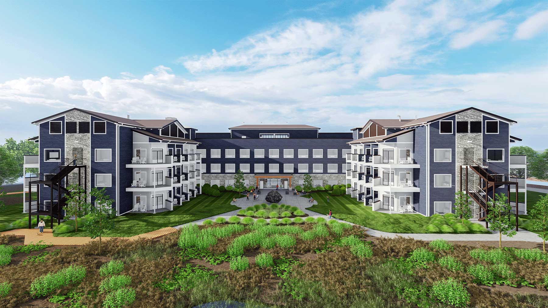 The Bay Mills Hotel and Resort is undergoing a major expansion, solidifying its position as a premier travel destination in Michigan’s Upper Peninsula! The resort is adding two expansive three-story wings for guest rooms. The central section reaches an impressive four stories, with the top floor partially opening up to a rooftop deck. This addition almost doubles the resort’s capacity with 135 new rooms, 12 of which are deluxe and include a fireplace and jacuzzi. The expansion seamlessly matches the existing facility and the guest rooms were strategically designed in a stepped style allowing for 3/4 to have spectacular views with balconies overlooking Lake Superior.