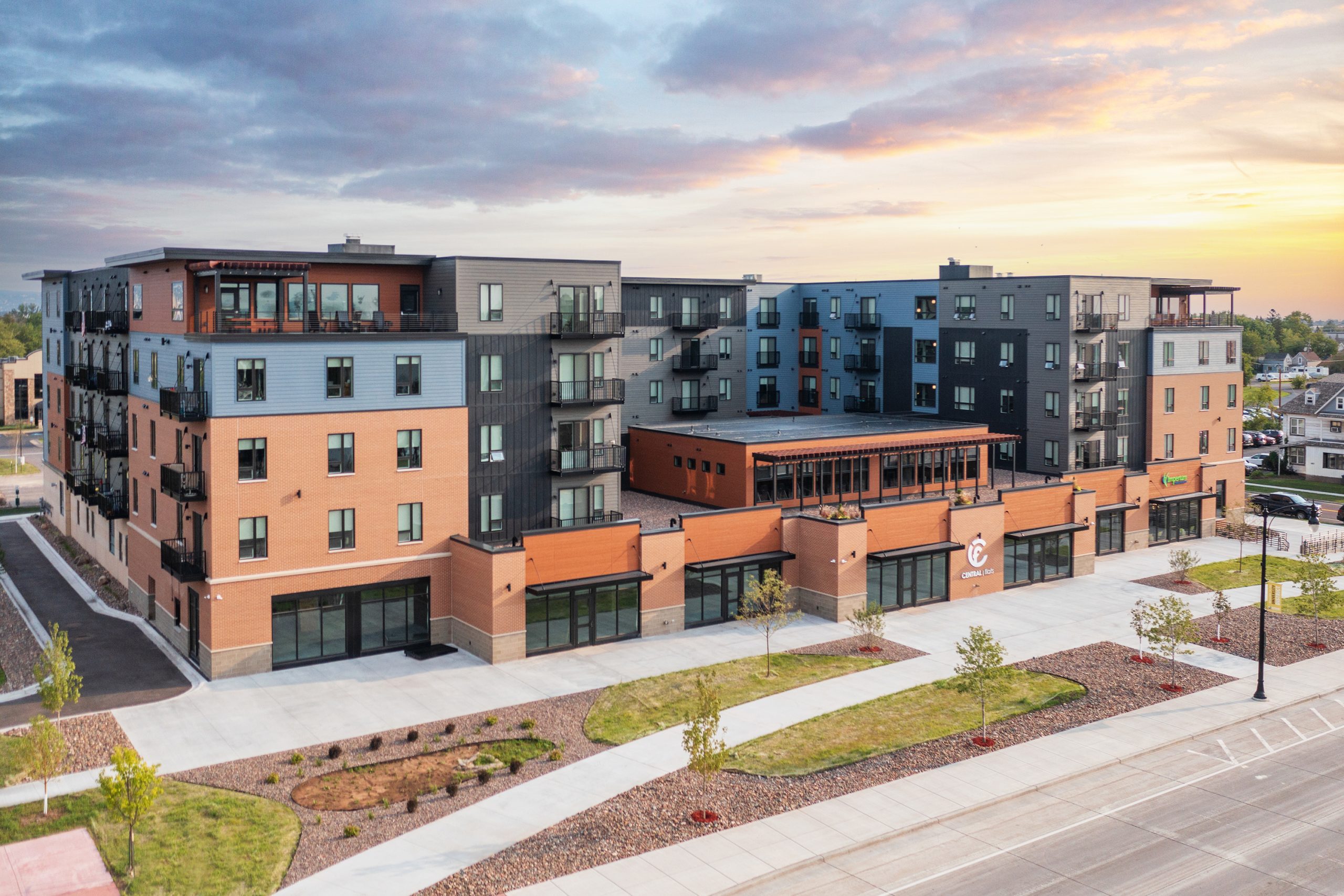 Central Flats blends the best of historic Superior with modern convenience and amenities. This new mixed-use development features micro, alcove, one, two and three bedroom apartments, an Entertaining Suite for residents to hold conferences or gatherings, a library and fitness room. Outside, residents can enjoy games and socializing at one of the three amenity decks. The modern construction is located near the heart of downtown Superior, within a short walk of the University of Wisconsin-Superior campus helping to cater to the student population in and around the area. The entire complex is all inclusive providing a living community for students, families, working professionals, and empty nesters.