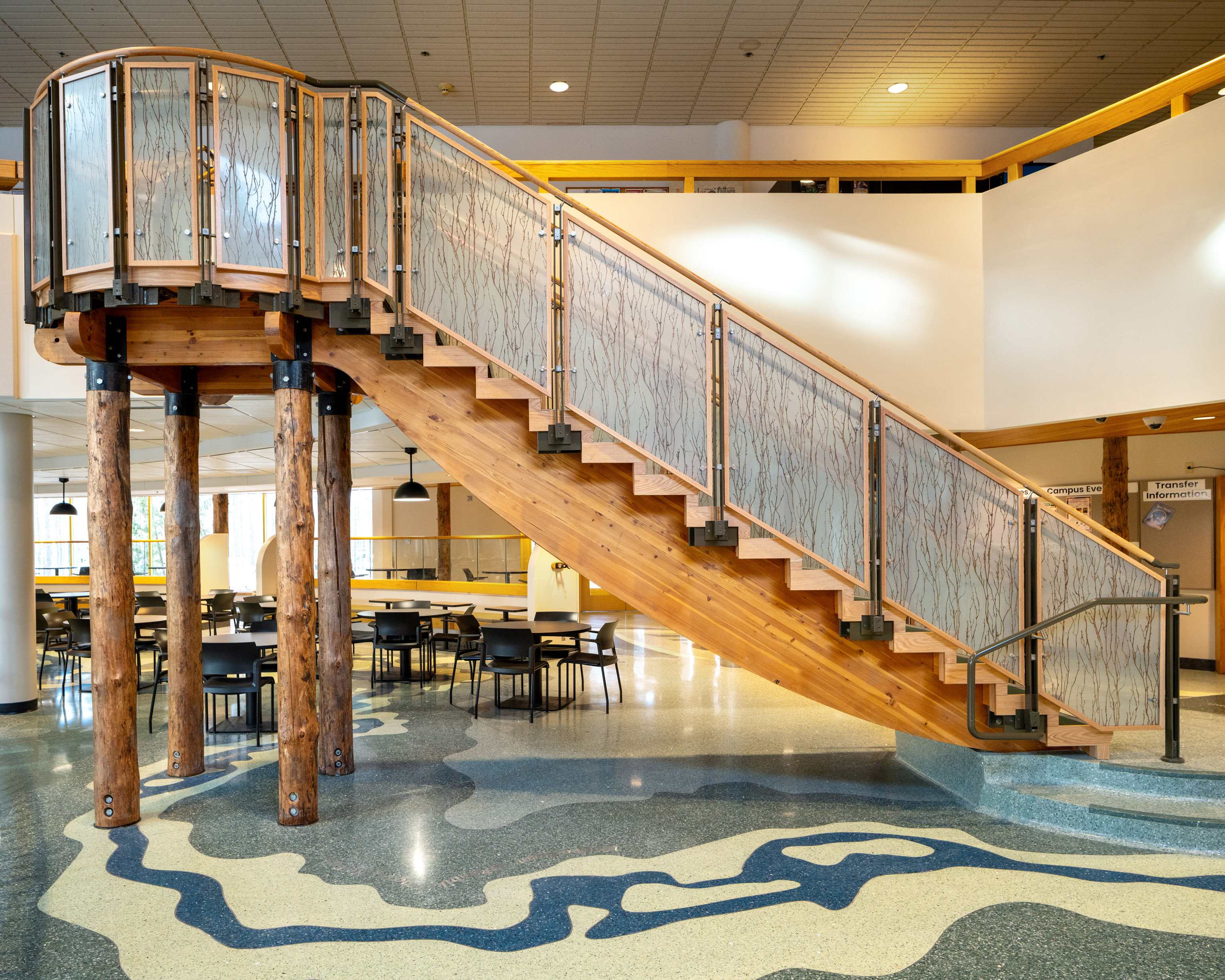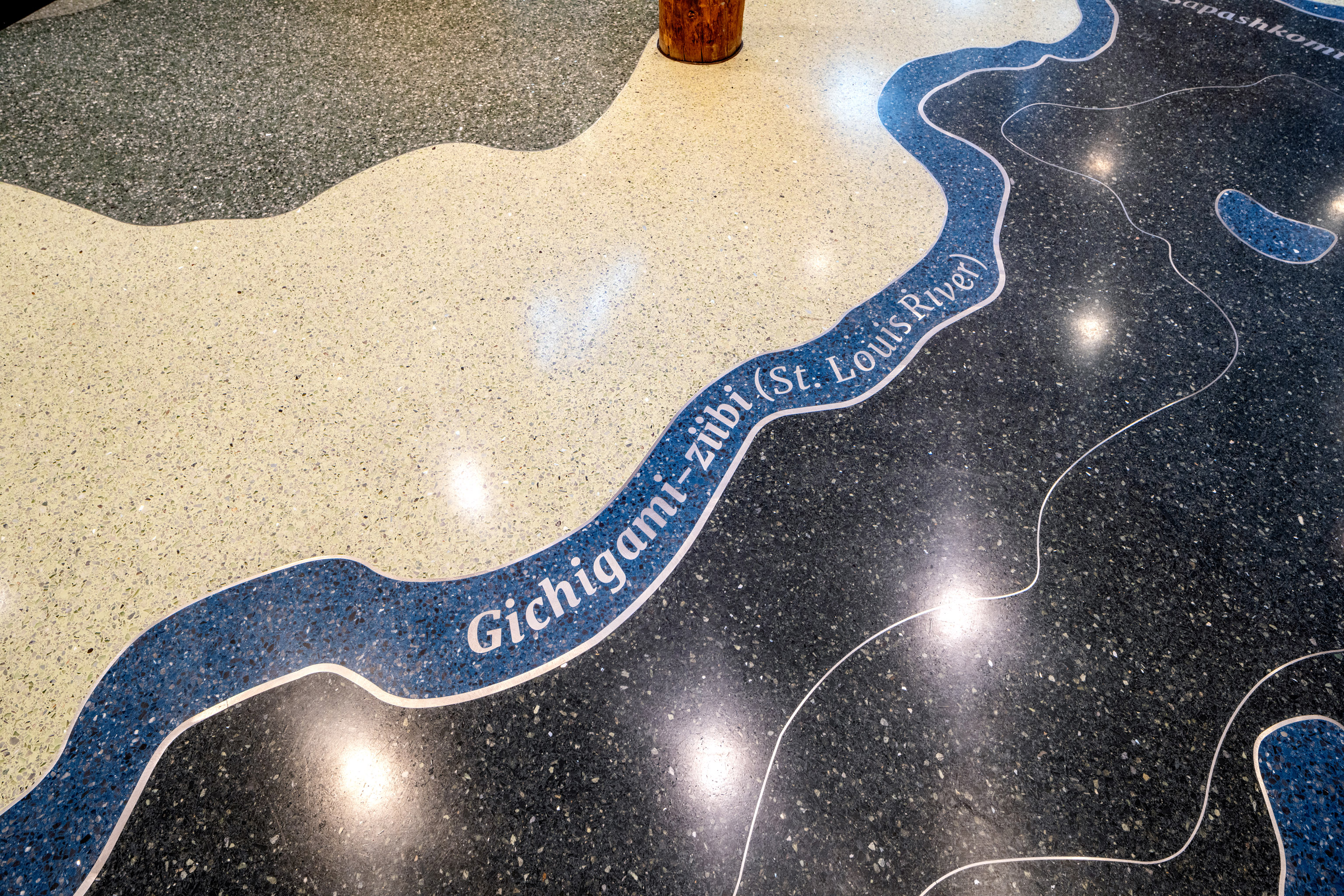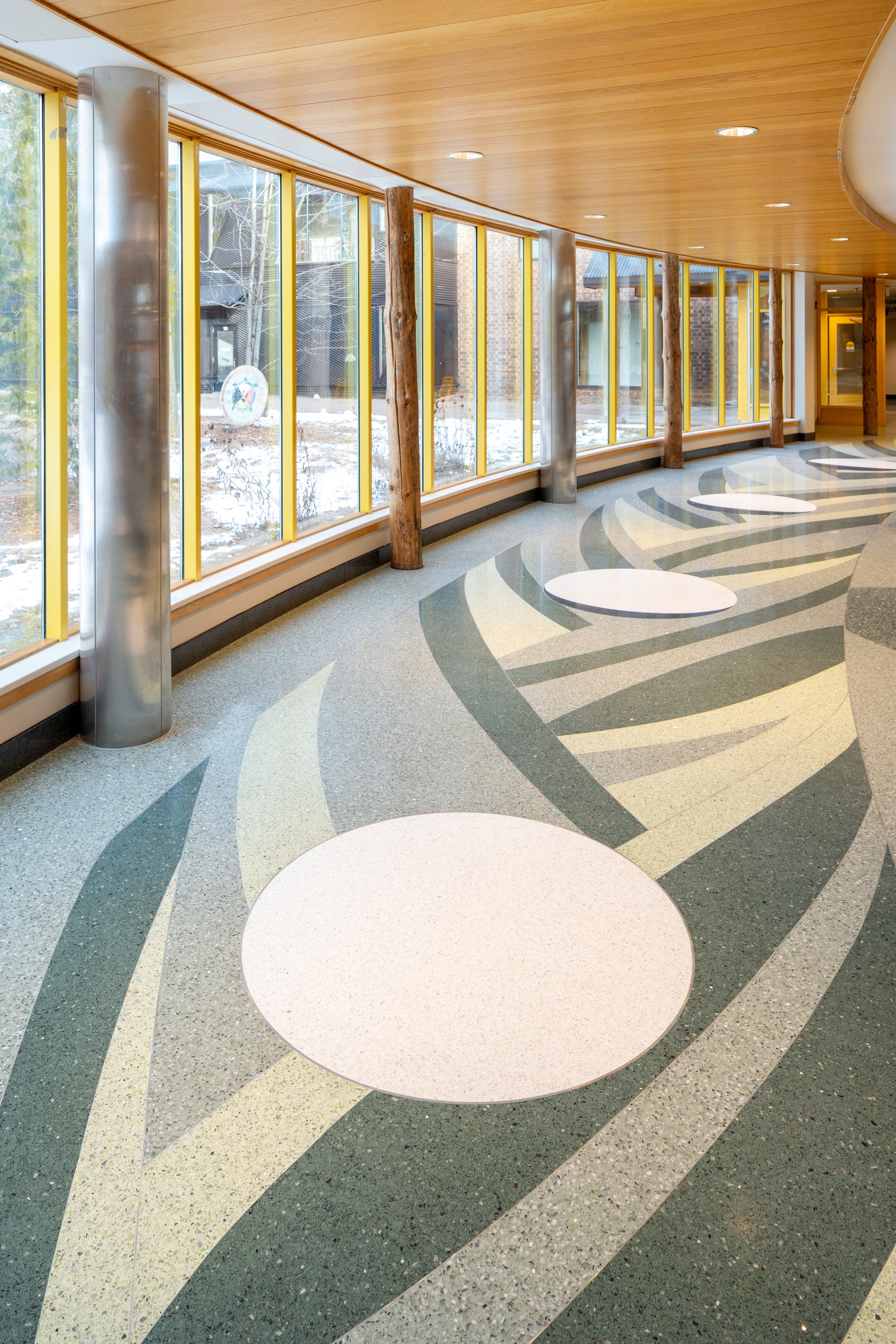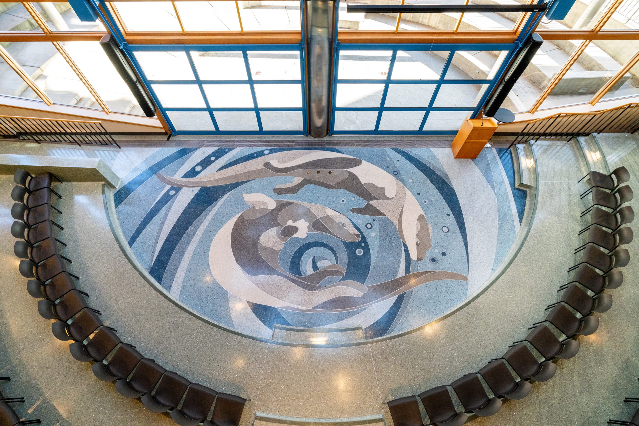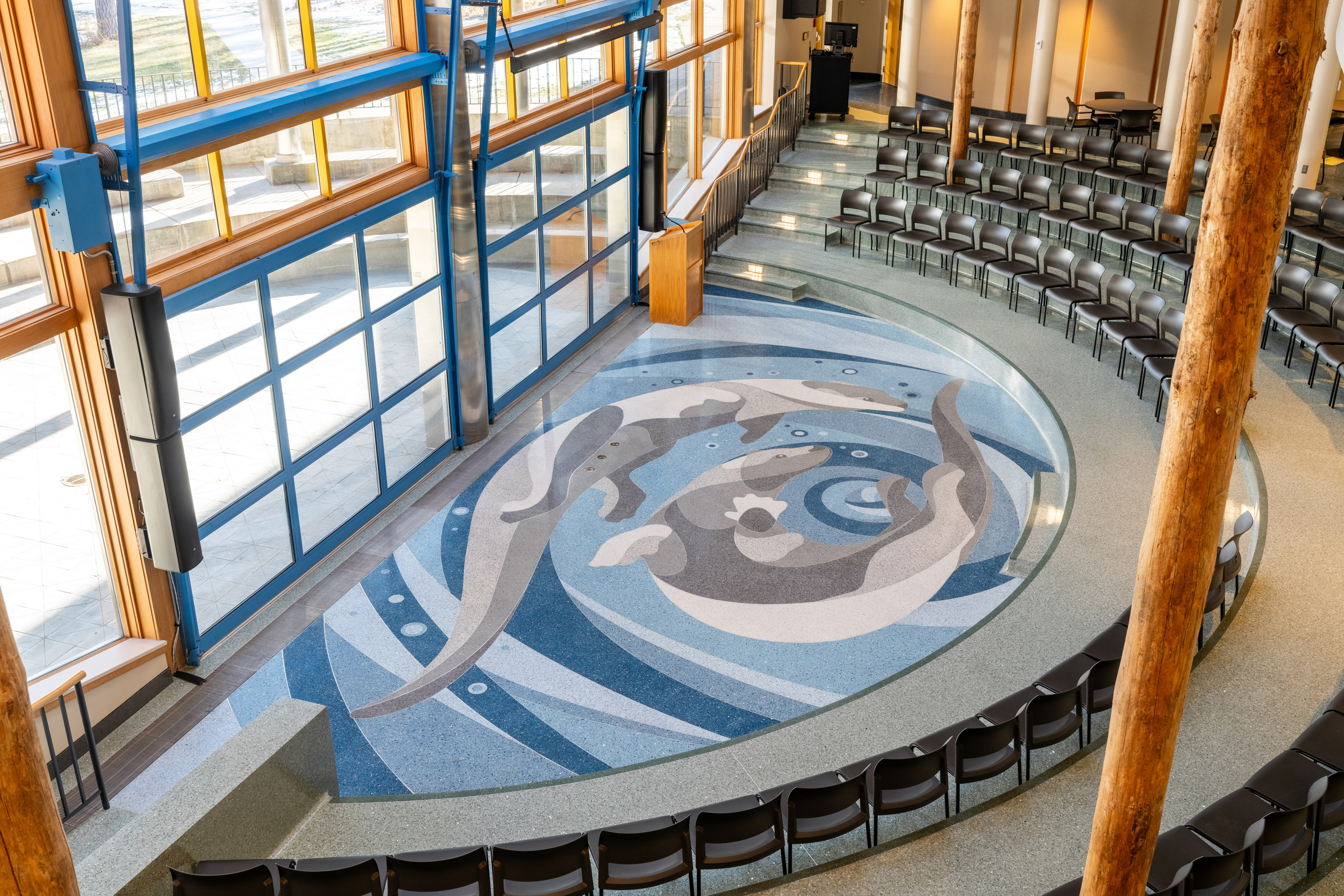 The commons/amphitheater terrazzo floor design is made up of 3 primary sections. The amphitheater section features two swimming otters, inspired by the painting “The Twins” by renowned Anishinaabe artist and faculty member Karen Savage-Blue. The second element features the St. Louis River Estuary, a design feature relatable to a broad range of community members and representing the college’s longstanding Union of Cultures. The final portion extends along the wall of windows facing the medicine garden, featuring braided sweetgrass and the 13-moon lunar cycle.