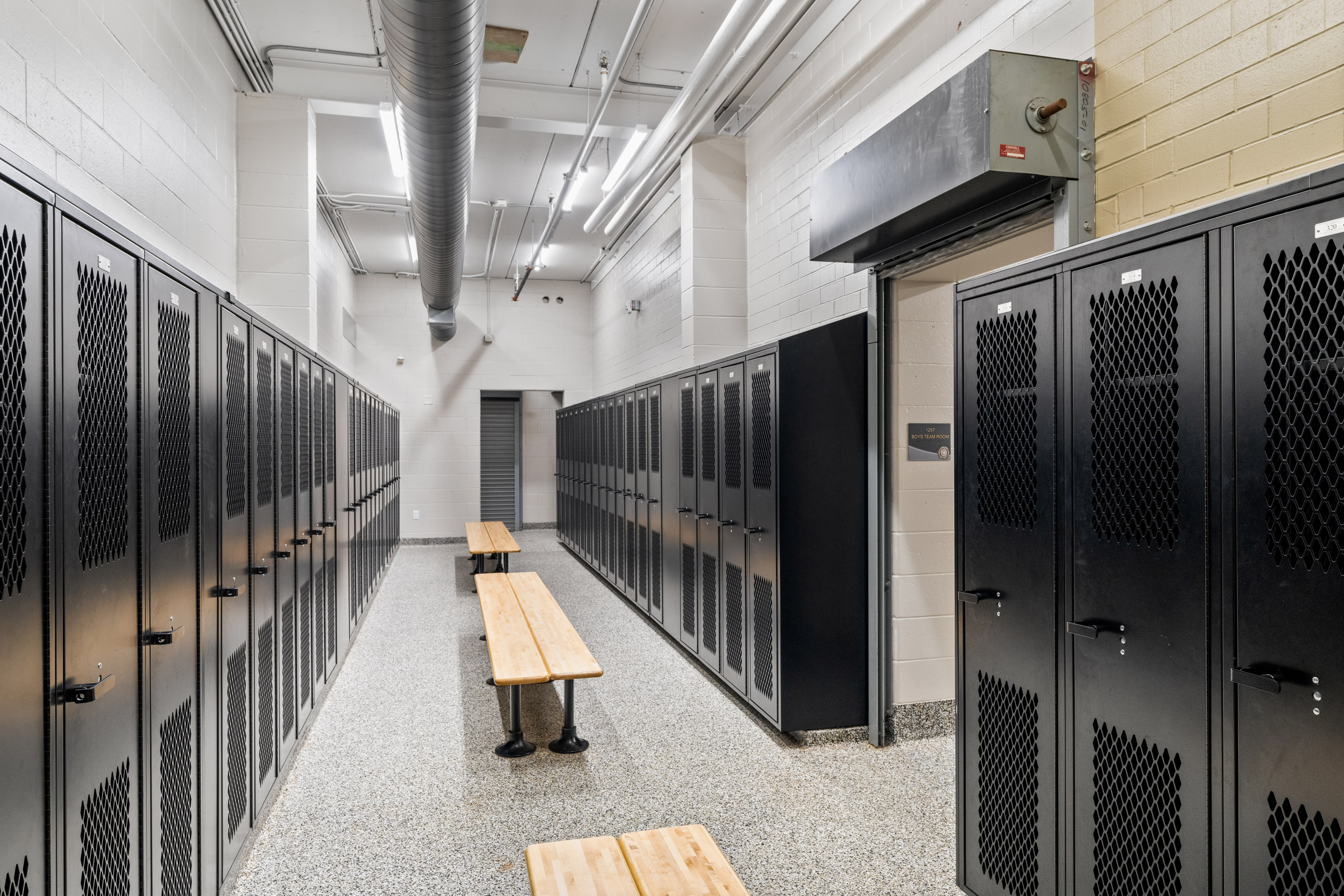 A key component of the project was integrating sustainability into the design while honoring the school’s history. Angela and her team repurposed materials from the existing structure, including wood from the school’s old bleachers, which was transformed into warm wood accents on the walls and ceilings.