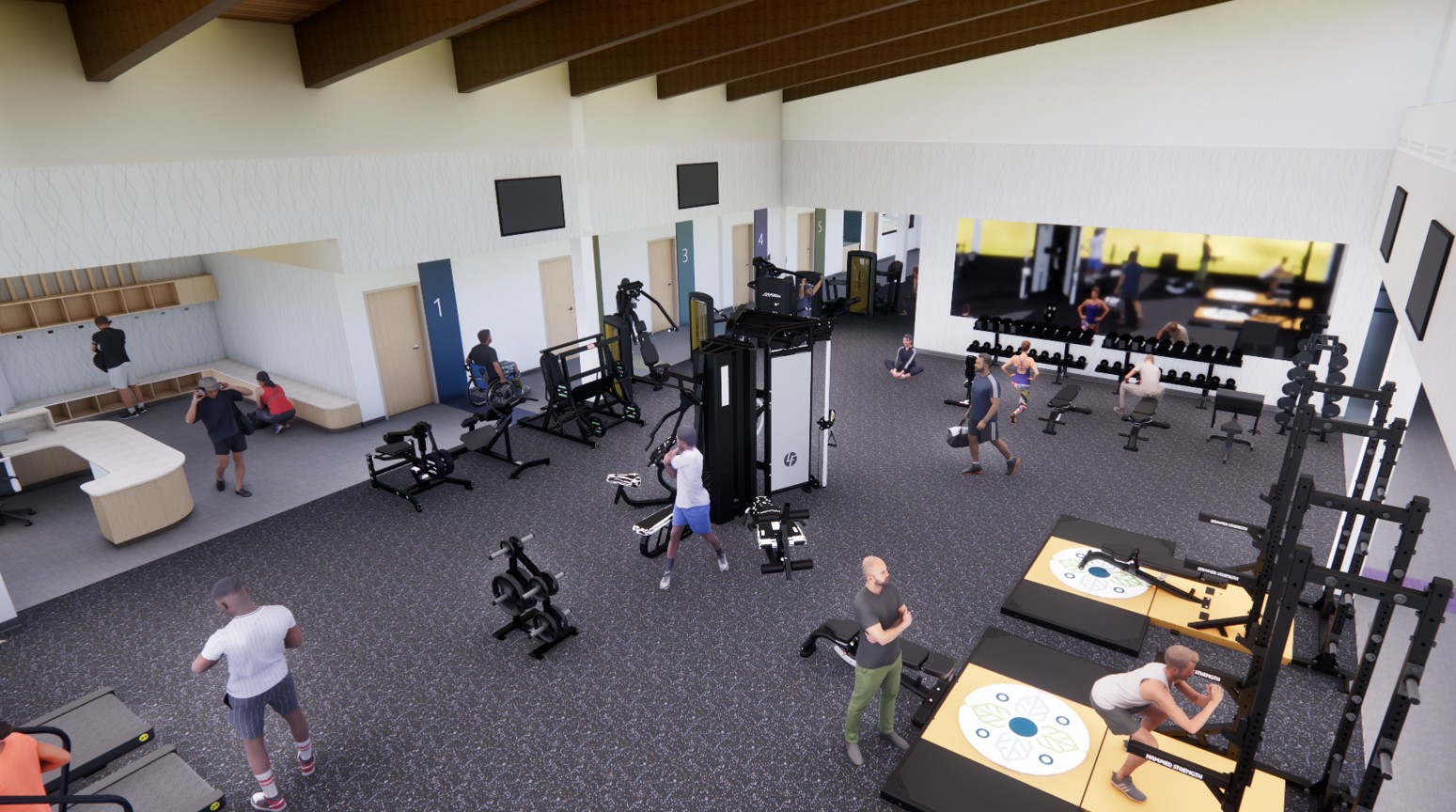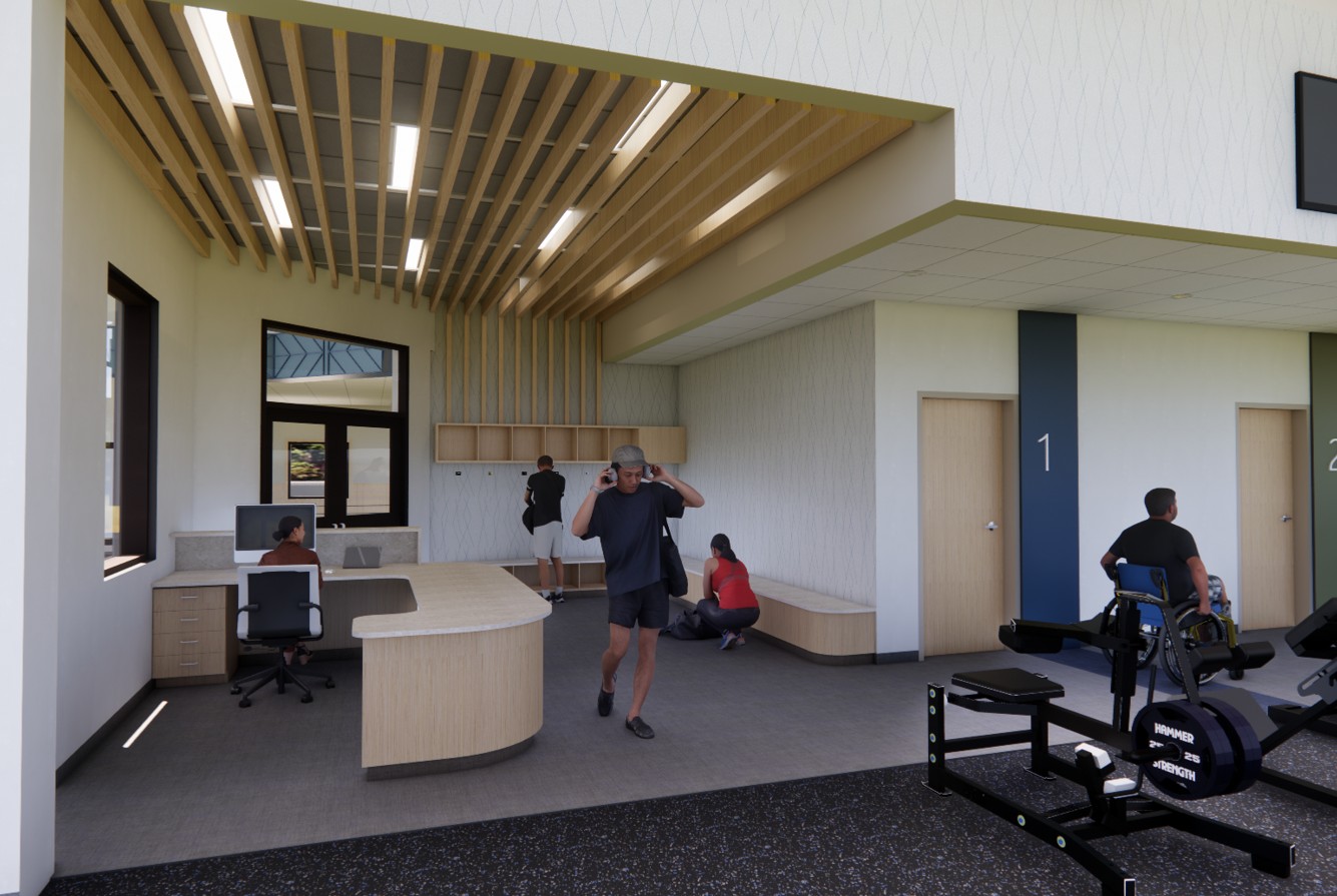 For staff, the expansion includes four private offices, each with windows to maintain the wellness theme, and a spacious break room/conference room that will be shared with the main Health Center. This shared space features adaptive seating for various uses.