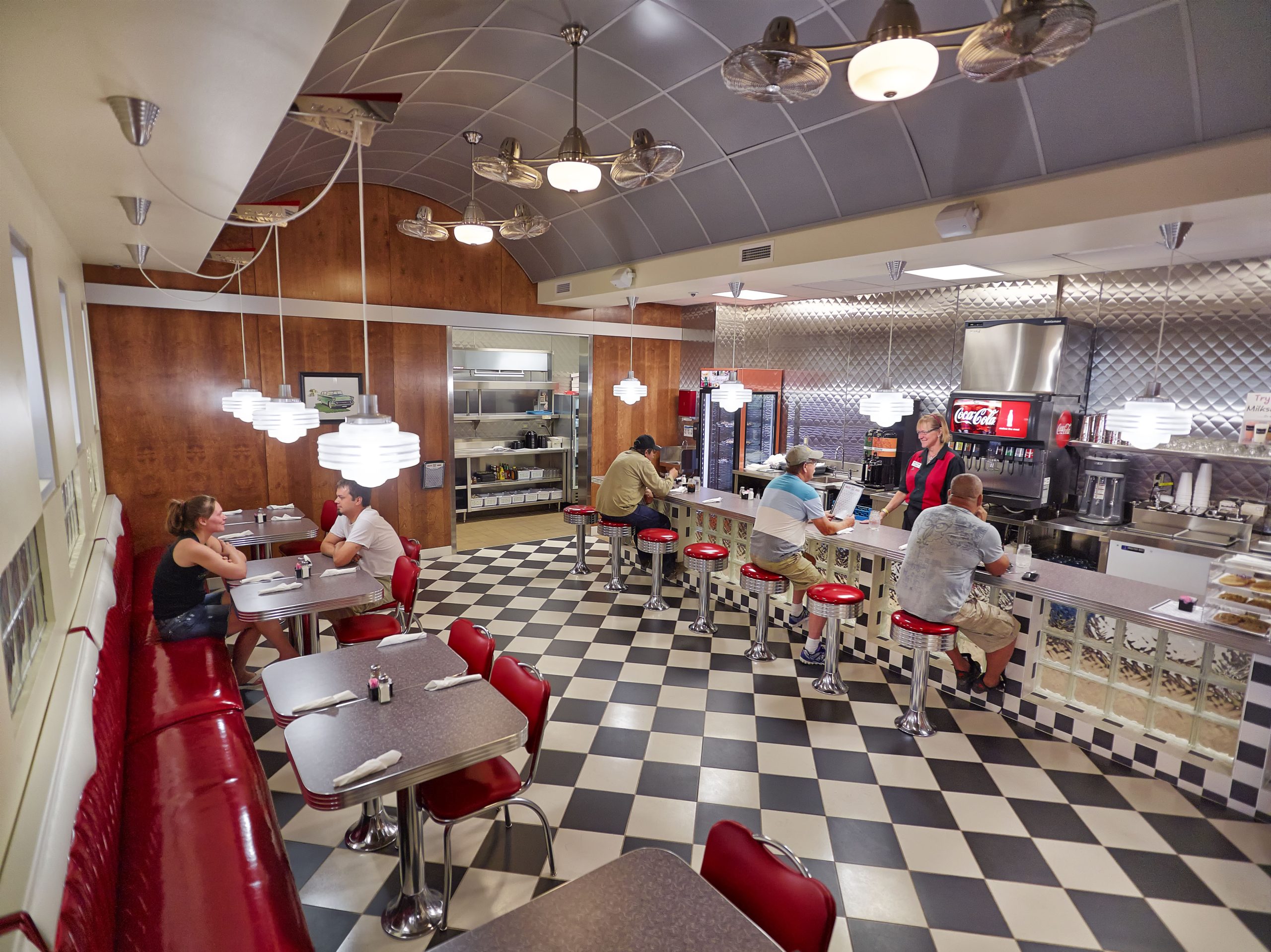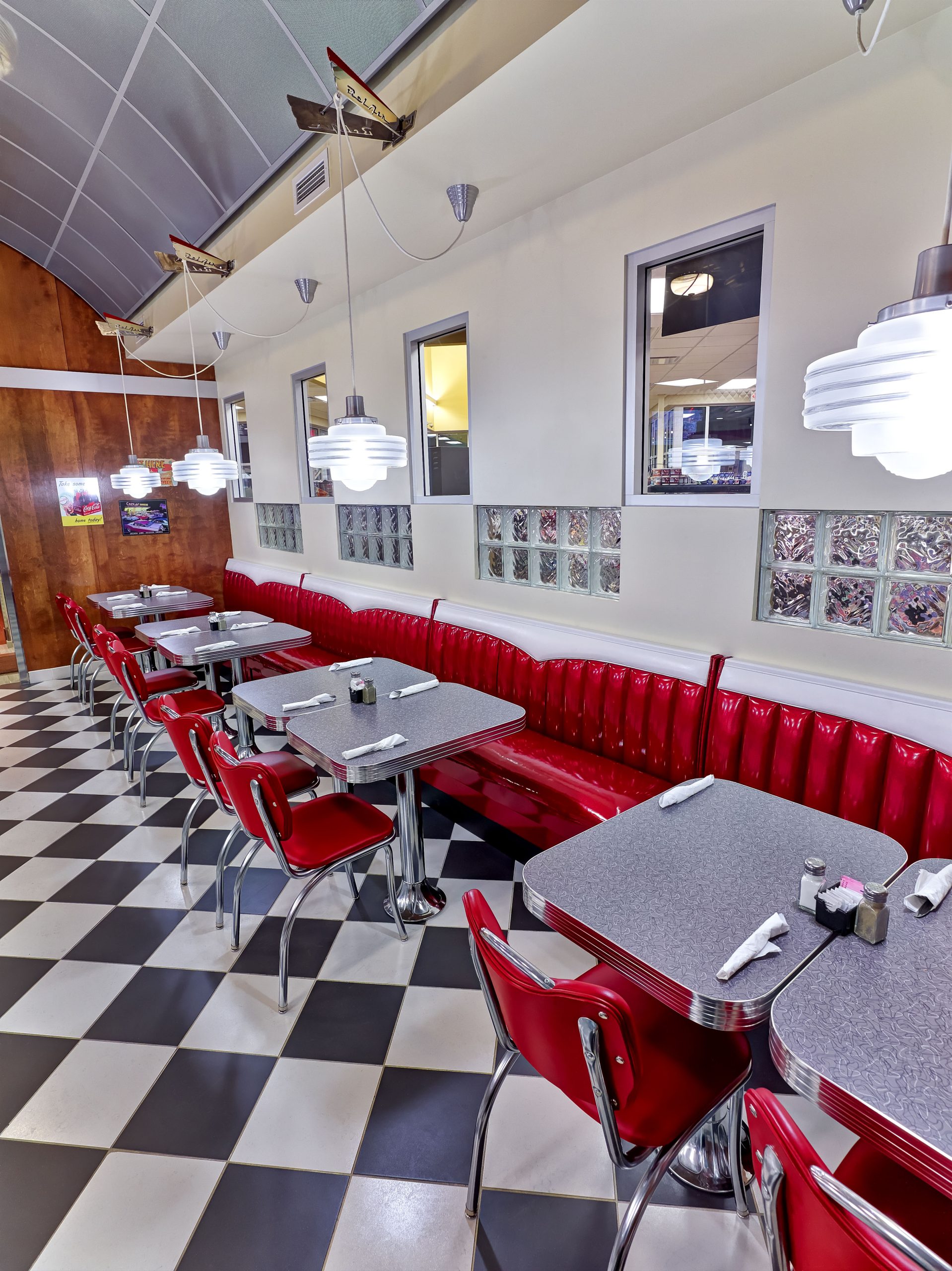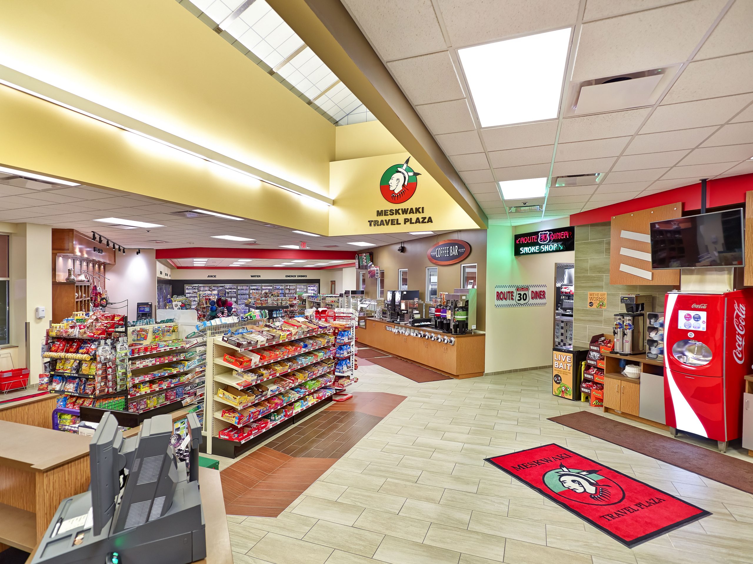 The Meskwaki Travel Plaza is focused on serving the needs of today’s travelers and professional drivers. Open 24 hours a day, the Travel Plaza offers a wide range of amenities with an emphasis on hospitality and customer service. To achieve a clear line of sight to all gas and diesel pumps, the floor plan incorporates a protruded sales area and shared areas were placed between the fuel registers to allow for control or possible closure of the truck stop. Visitors will find a luxurious lounge, laundry facility, showers, USB charging stations, convenience store and a retail truck center. It also has a 50s-themed restaurant attached to the convenience store.