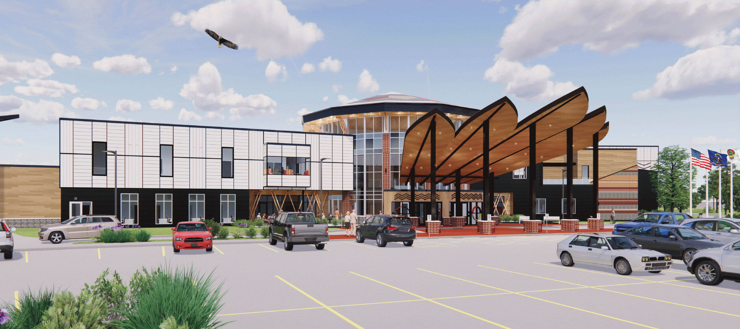 The North Segment Community Center will be a hub of action. The site and building is designed to house loads of activities for the North Segment Tribal Community. On the grounds visitors can enjoy a game of frisbee golf, horseshoes, play basketball, softball, volleyball, tennis, or even hit a few balls on a putting green! Inside the 2 story facility a day can be spent by pool with flowing lazy river, while taking in the sun and breeze through the retractable roof. Additional community spaces such as a craft room, lecture hall, elders kitchen, playground, gymnasium, walking track and offices including home healthcare make up the remainder of this 100,000 sf facility.