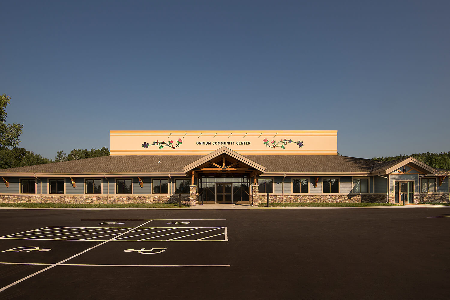 The Onigum Community Center’s new gymnasium is home to the Onigum Night Hawks. Other features include community gathering spaces, education spaces, commercial kitchen, fitness area, and a small Tribal clinic. The building has a 75+ year life span and lower energy costs by about 30% due to its usage of Insulated Concrete Forms for construction and other high performance design features.