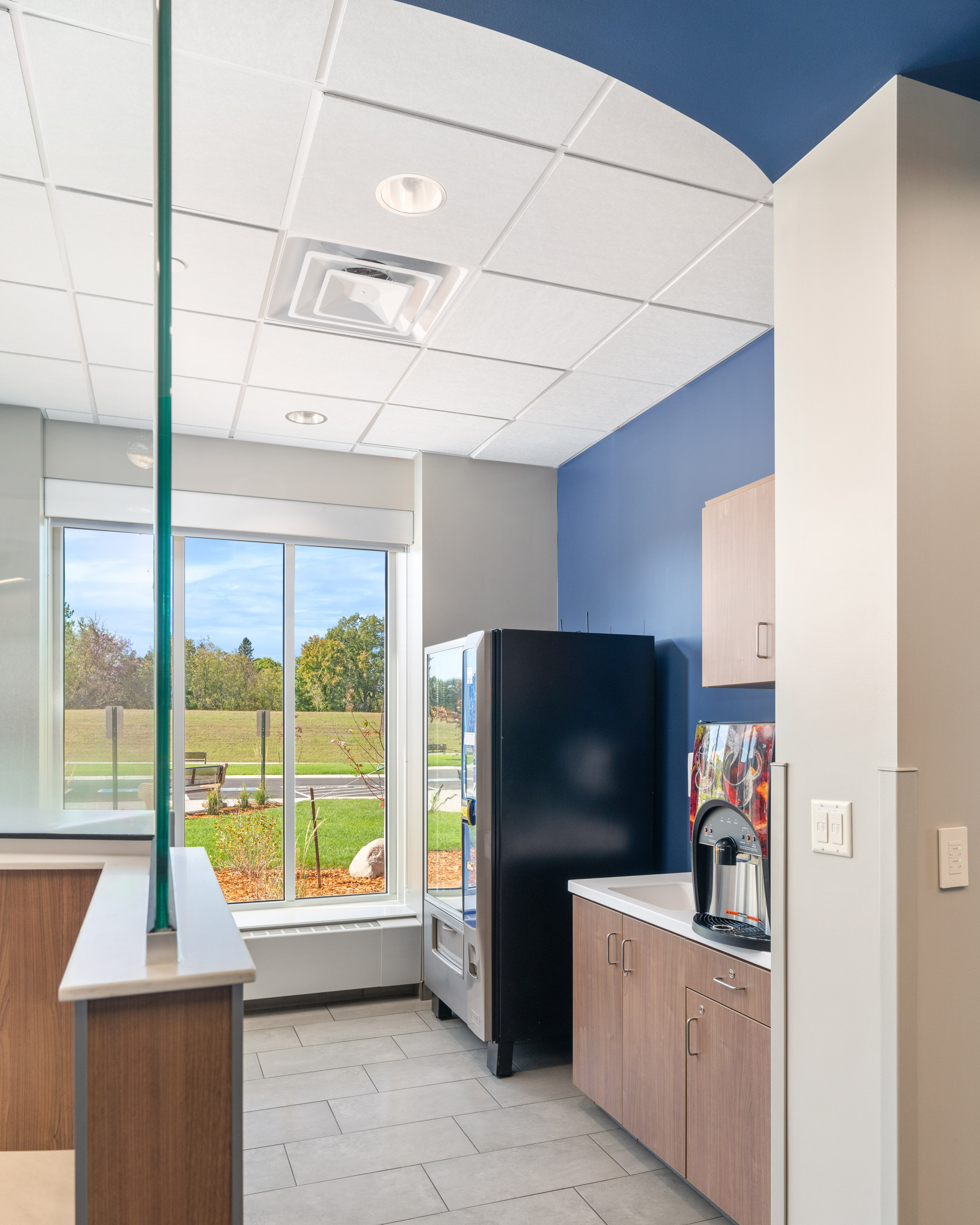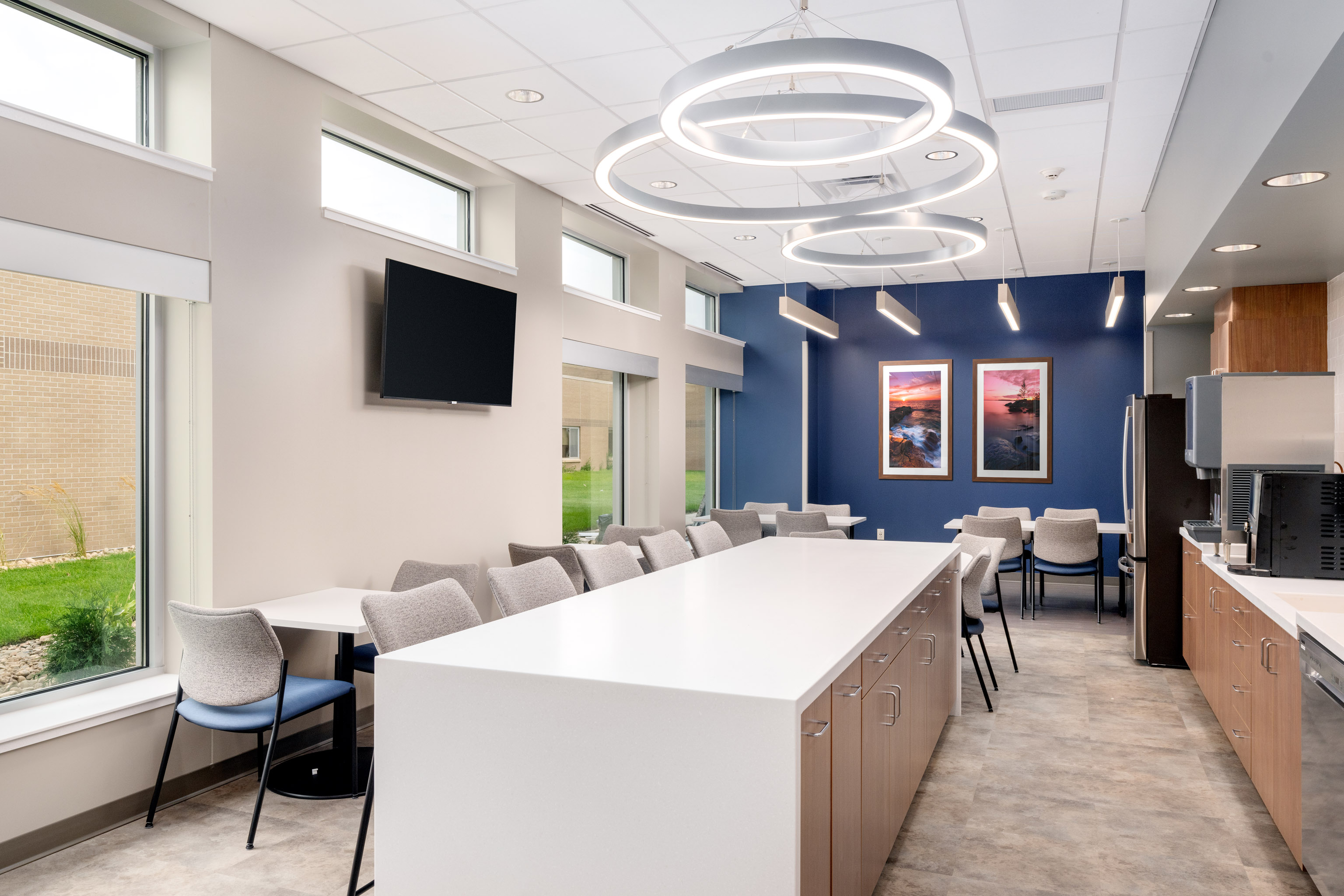 Riverwood Healthcare Center Staff Surgical Lounge: Riverwood Healthcare Center was designed for the people who work there, staff areas were designed to be comfortable and functional, allowing space for them to relax and recharge during their shifts.