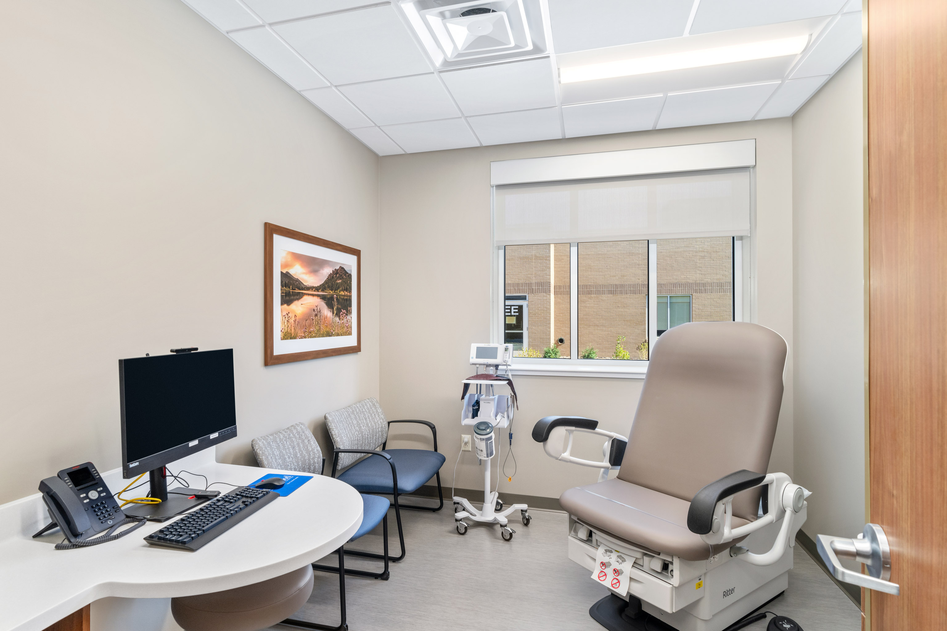 Riverwood Healthcare Center clinic rooms. Riverwood Healthcare Center clinic rooms were designed with a focus on patient-centered design. Plus, they allow for natural light as well as artwork with biophillic elements to help calm the patients.