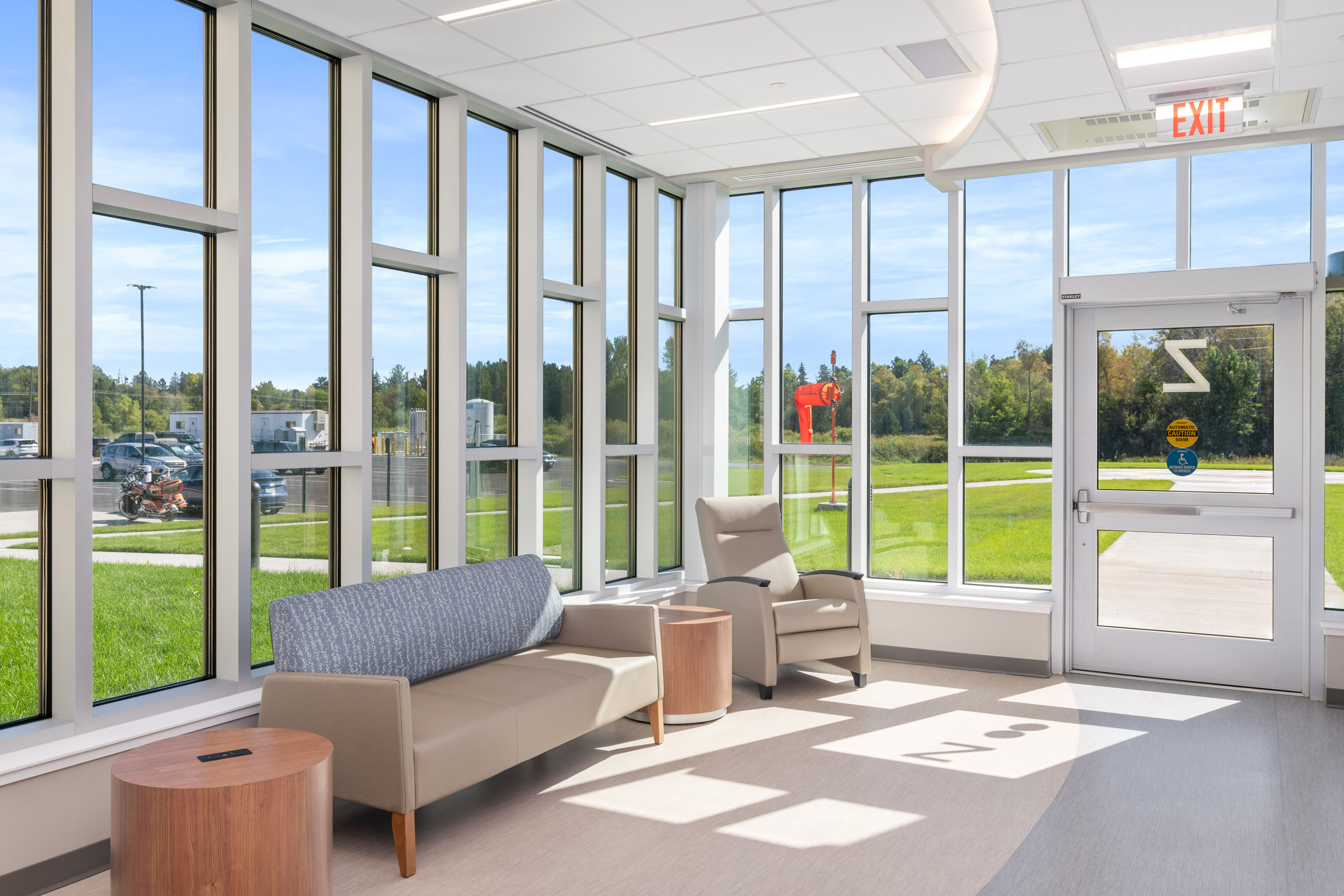 Riverwood Healthcare Center waiting area near patient rooms. A bonus space was made at the end of a hallway that was not being used. The design team went with floor to ceiling windows allowing a flood of natural light, a perfect recovery area for staff or patients.