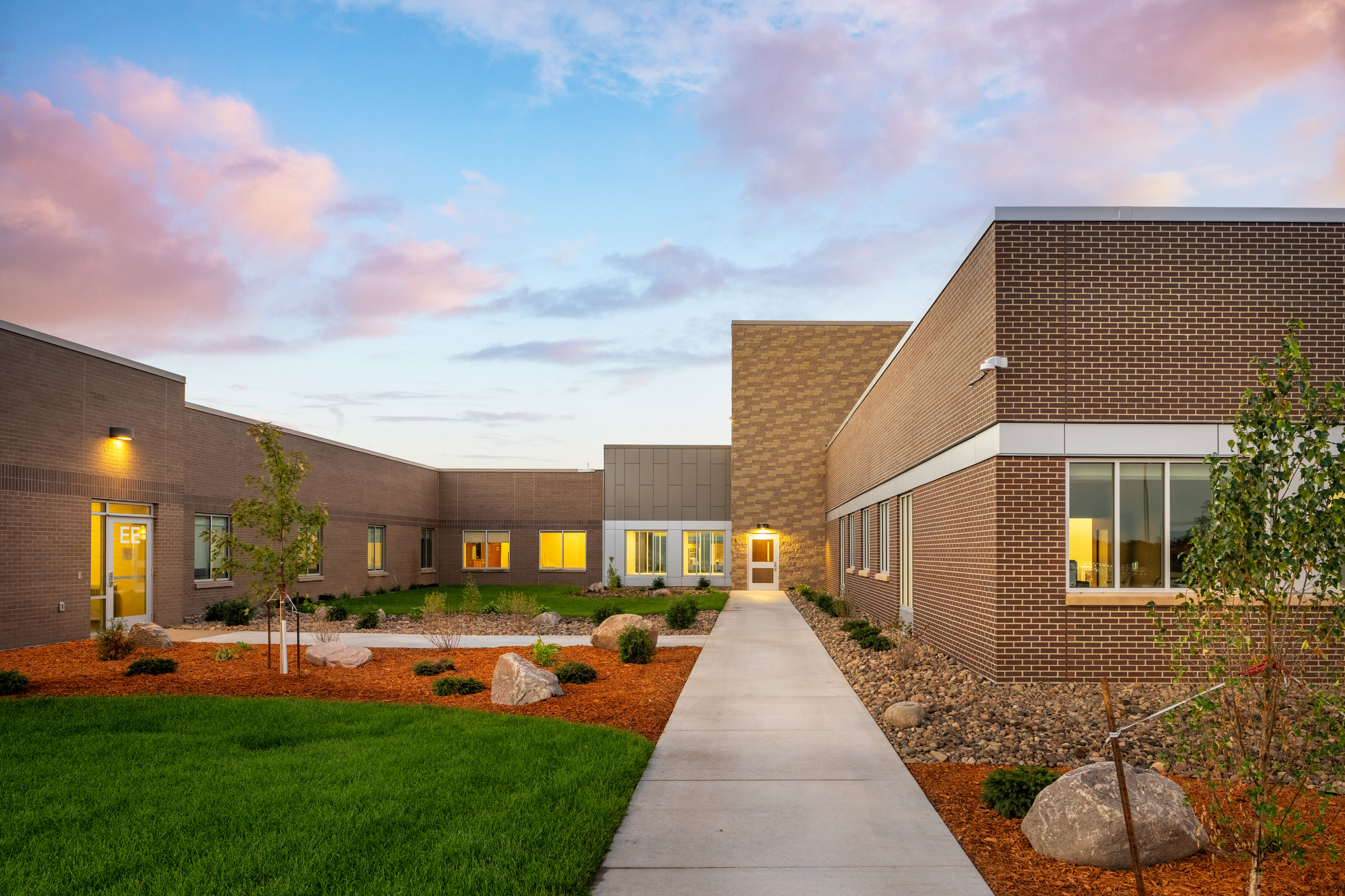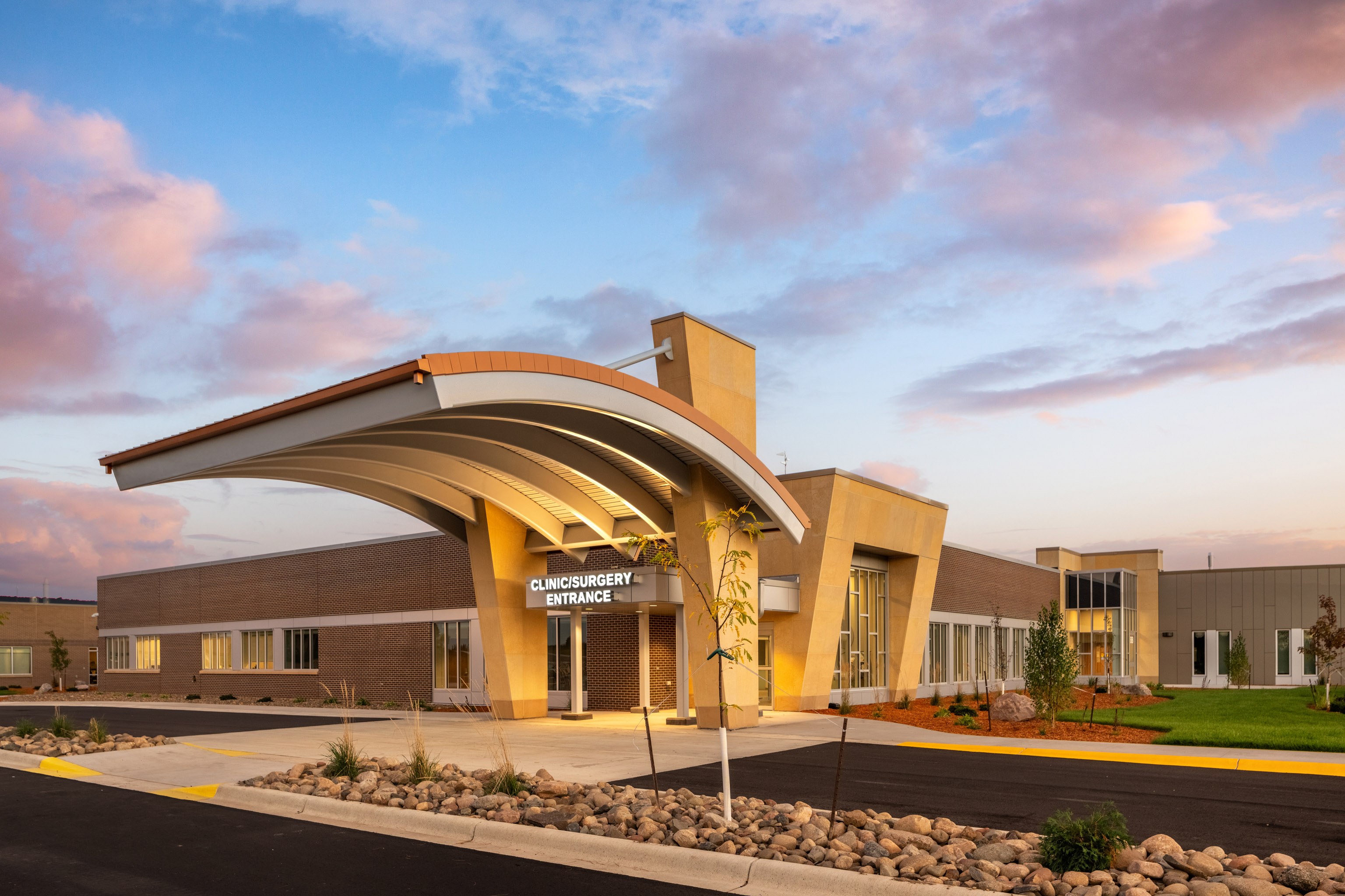 Riverwood Healthcare Center’s Clinic and Surgical Entrance: Riverwood Healthcare Center’s Clinic and Surgical Entrance features a freestanding, clam-shell overhang that provides patients with easy, barrier-free access to the building, while protecting from the Minnesota weather.